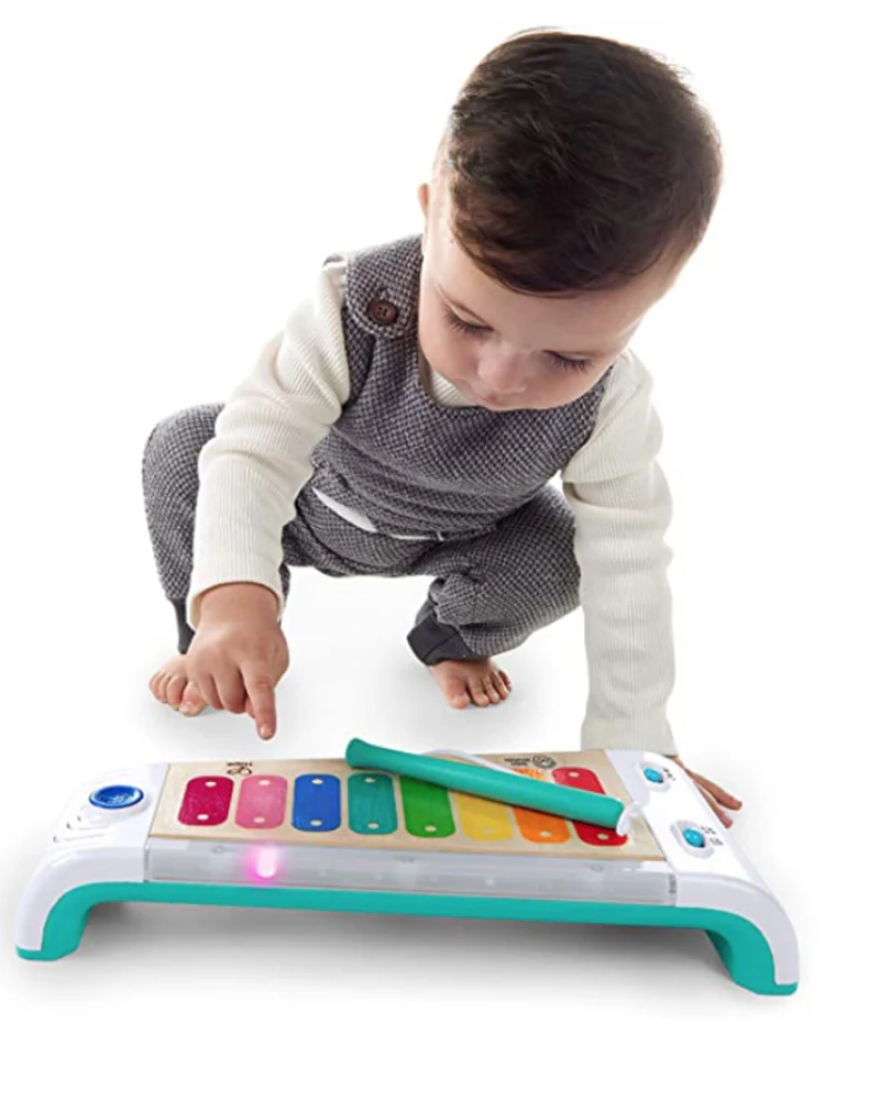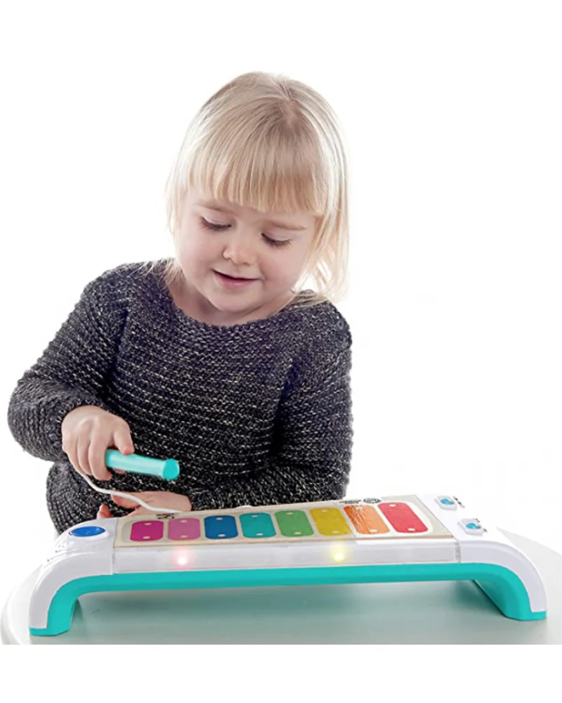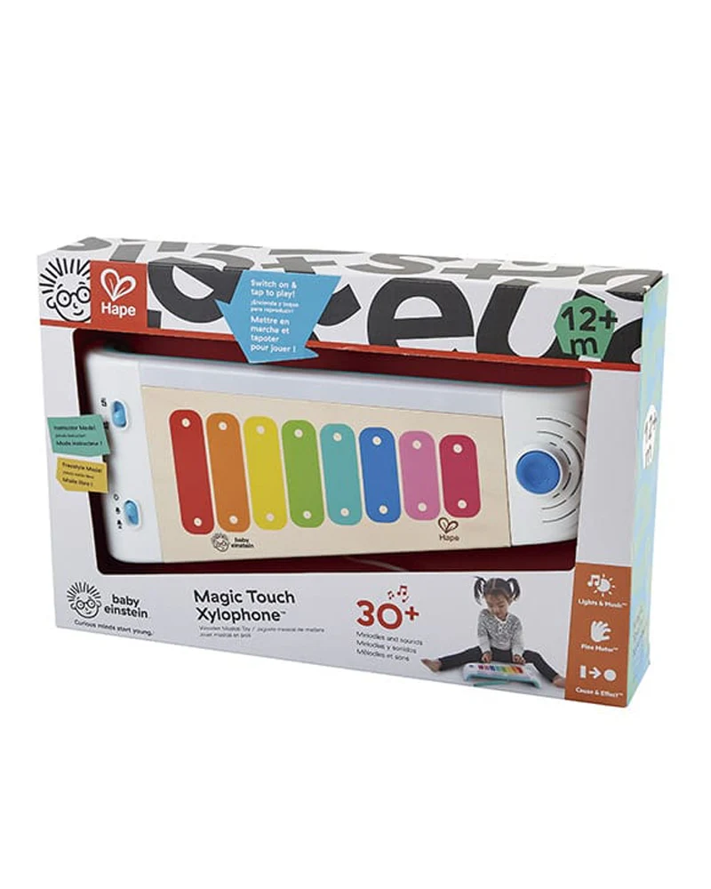 Le Magic Touch Xylophone est un xylophone en bois électronique de la marque Hape pour l’éveil musical des enfants à partir de 12 mois. Avec ce xylophone de la gamme Baby Einstein, votre petit artiste en herbe profite de la noblesse du bois et de la magie de l’électronique pour s’initier aux sons des musiques classiques (Beethoven, Vivaldi, Mozart, Strauss, Handel et Chopin) et à l’éveil musical. En mode instructeur, les lumières colorées le guident vers les bonnes notes. Le bouton Einstein lui permet de lancer une des 30 mélodies proposées. Une fois à l’aise, votre petit musicien passe en mode libre et tapote les barres avec ou sans le maillet pour créer ses propres compositions. Et pour varier les plaisirs, le bouton Einstein lui permet de changer la mélodie de fond ! Un jouet musical amusant et bien construit pour faire découvrir la musique aux tout-petits. Une façon ludique de s’initier à la musique avec son format nomade qui en fait un jouet à transporter partout ! Fonctionne avec 3 piles AA LR6 fournies. 2 niveaux de volume sonore.