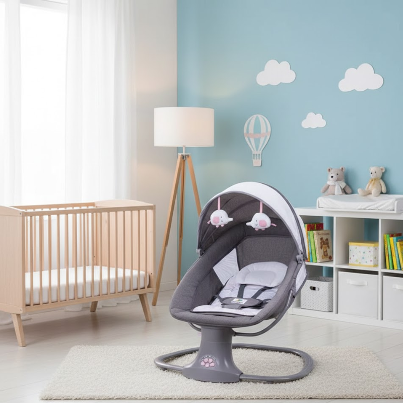 Côté sécurité, la balancelle est dotée d’un harnais de sécurité à 5 points, assurant un maintien optimal. Elle fonctionne avec double alimentation (USB et piles), offrant une grande flexibilité d’utilisation à la maison ou en déplacement.