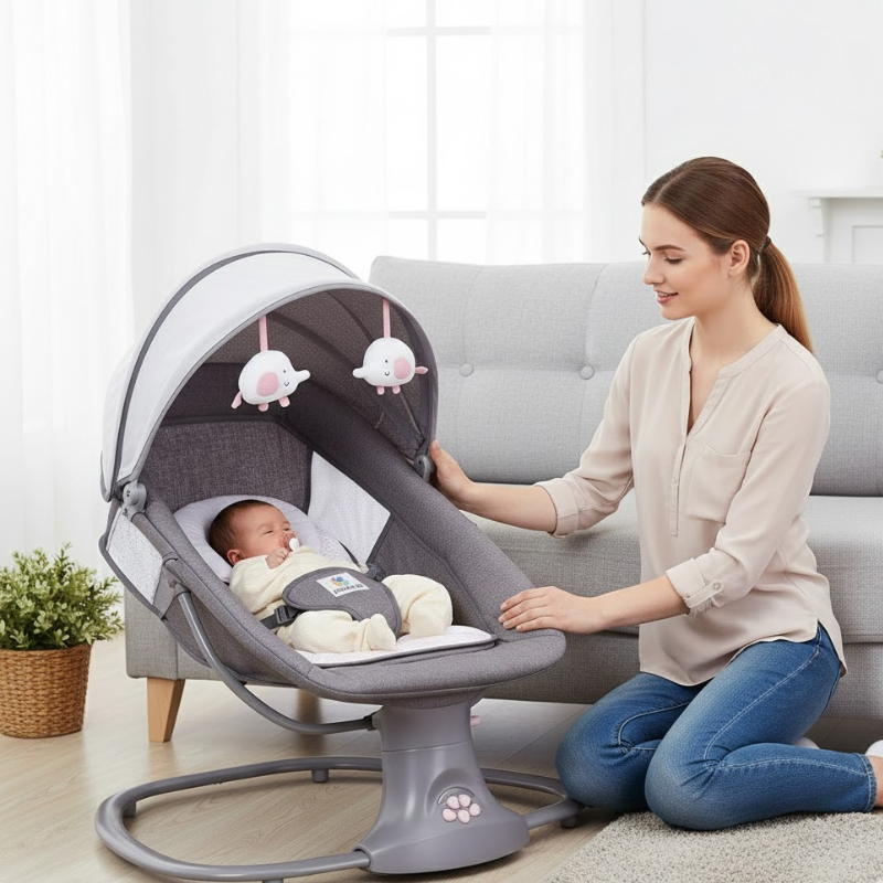 La Balancelle Électrique Mastela 3 en 1 – Gris Clair Rose est une solution complète pour le confort de bébé. Multifonction, musicale et sécurisée, elle propose des mouvements latéraux, plusieurs vitesses de balancement, des mélodies apaisantes et une inclinaison réglable. Adaptée de la naissance jusqu’à 18 kg.