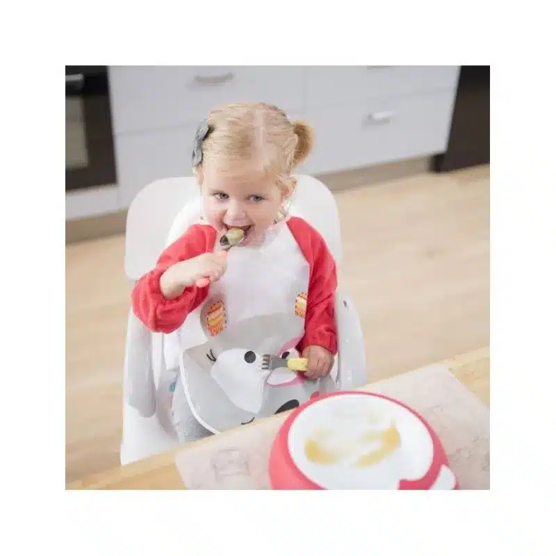 – Pratique : manches pour bien protéger l’enfant qui mange tout seul