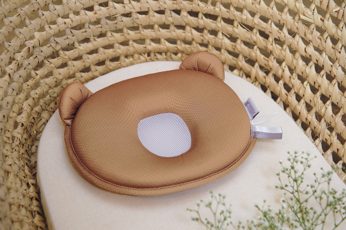 Le coussin P’tit Panda Air+ Candide Cassonade maintient la tête de bébé bien ronde tout en assurant confort et aération dès la naissance.
