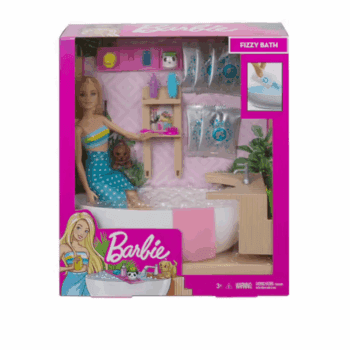 Cette poupée Barbie porte un bikini moulé sur son corps articulé (sept points) pour faciliter le jeu de bain. Elle s’entoure d’une baignoire, de nombreux accessoires, d’un chiot et de six sachets de poudre de bain effervescente et pétillante au parfum relaxant à verser dans l’eau du bain de la poupée.