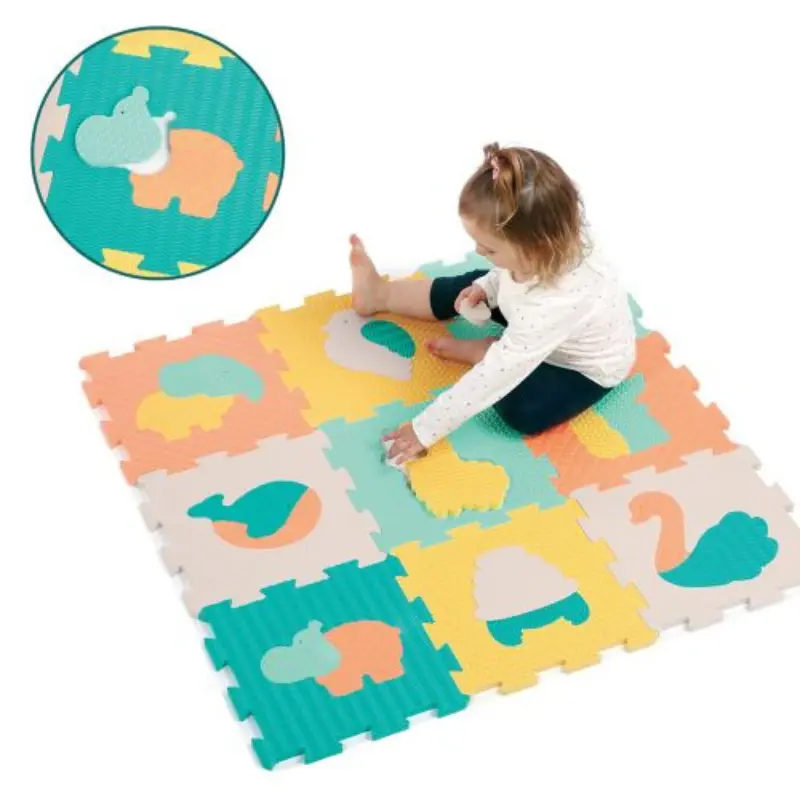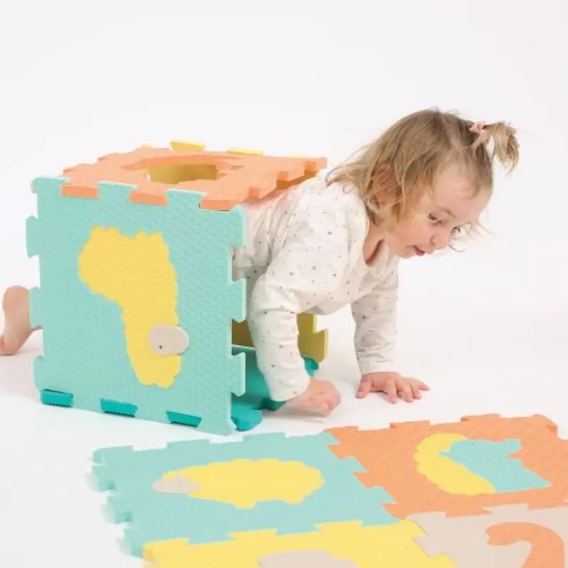 Les 9 dalles animaux « pastel » forment un beau tapis confortable et sécurisé qui isole l’enfant du sol. Puzzle géant avec les animaux à encastrer ! Différentes textures à découvrir.