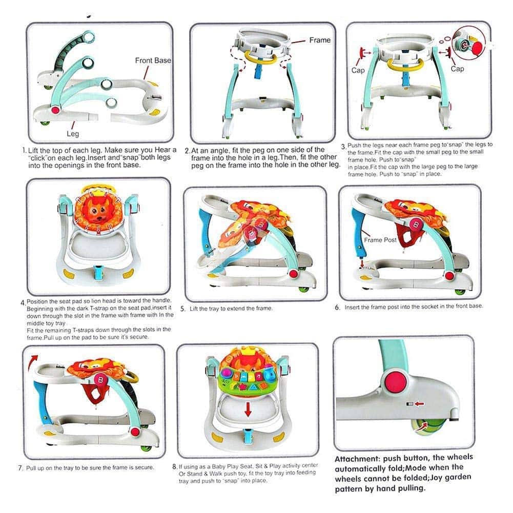 Trotteur 4 EN 1 avec; centre d’activités, trotteur assis, poussette d’apprentissage et chaise haute d’alimentation. Cette conception multifonctions grandit avec votre bébé. Se convertit facilement d’un déambulateur d’activité assis à un déambulateur d’apprentissage à conducteur marchant. Le coussin de siège est favorable et confortable. Centre de jeu d’activités musicales multifonctionnel avec mélodies et chansons, asseyez-vous pour jouer ou emmenez-vous pour jouer, encouragez les premiers pas de bébé et continuez à bouger avec de la musique. Posez le plateau à plat et enlevez la planche musicale, bébé pourra prendre son repas dessus. Avec une large base extra-stable pour empêcher bébé de se retourner, les roues robustes fonctionnent aussi bien sur les sols que sur les tapis. L’avant peut être verrouillé et garder bébé et trotteur en place, évitant que bébé ne perde le contrôle et ne tombe. Fabriqué dans un matériau écologique qui est sûr à utiliser pour votre bébé. Matériaux de haute qualité et respectueux de l’environnement. Toutes les pièces sont détachables, peuvent se plier à plat pour le stockage et le voyage. Aide à développer la motricité de bébé. Module d’apprentissage (pour connaître les formes et les nombres) Module d’éducation précoce (comprend une chanson, des histoires et une blague) Module d’interlocution (le bébé doit gérer en fonction des questions) Contrôle du volume marche-arrêt Sélection du mode Une variété de effets sonores. roues texturées, poignée facile à saisir et conception durable, le déambulateur robuste offre tout le soutien dont ils ont besoin pour faire leurs premiers pas.