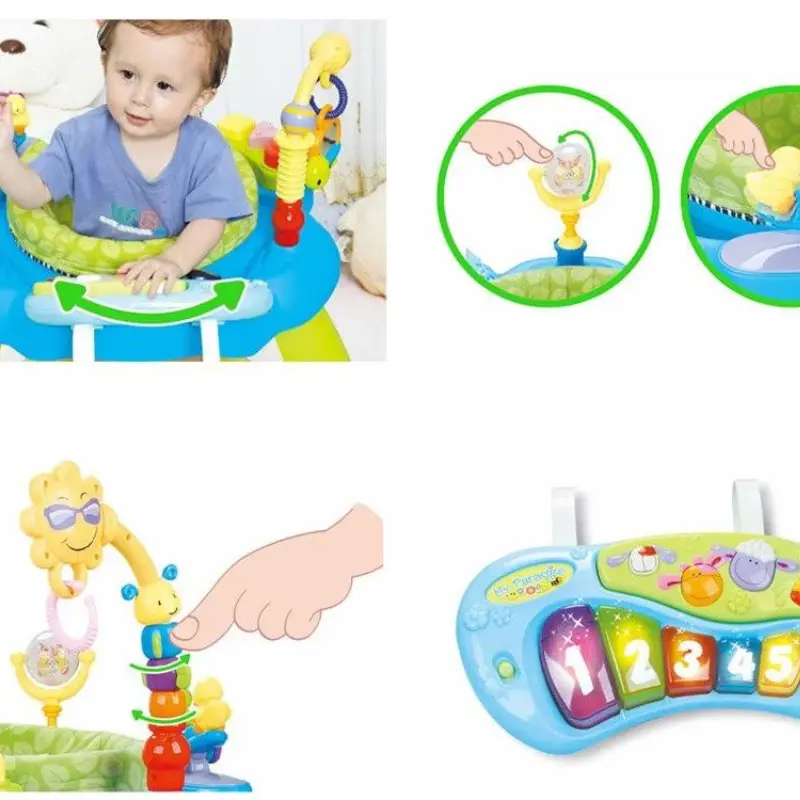 Le jumper regroupe plusieurs accessoires: clavier, bouton, hochets suspendus, avec de beaux sons et lumières pour divertir le bébé au maximum. Un jeu complet pour développer l’ensemble des capacités,et grandit avec eux puisque son siège est ajustable.