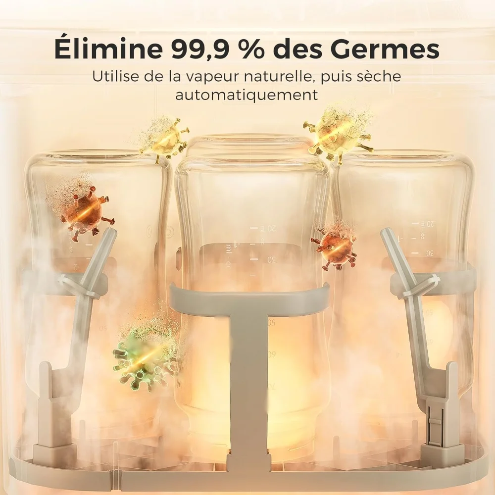Son panneau tactile LED facilite l’utilisation et permet de suivre la progression du programme en un coup d’œil. Vous pouvez combiner librement les modes selon vos besoins : lavage rapide, lavage normal, stérilisation, séchage et stockage. Les cycles vont de 19 minutes pour un lavage rapide à 72 heures pour le stockage prolongé, offrant une flexibilité totale aux parents.