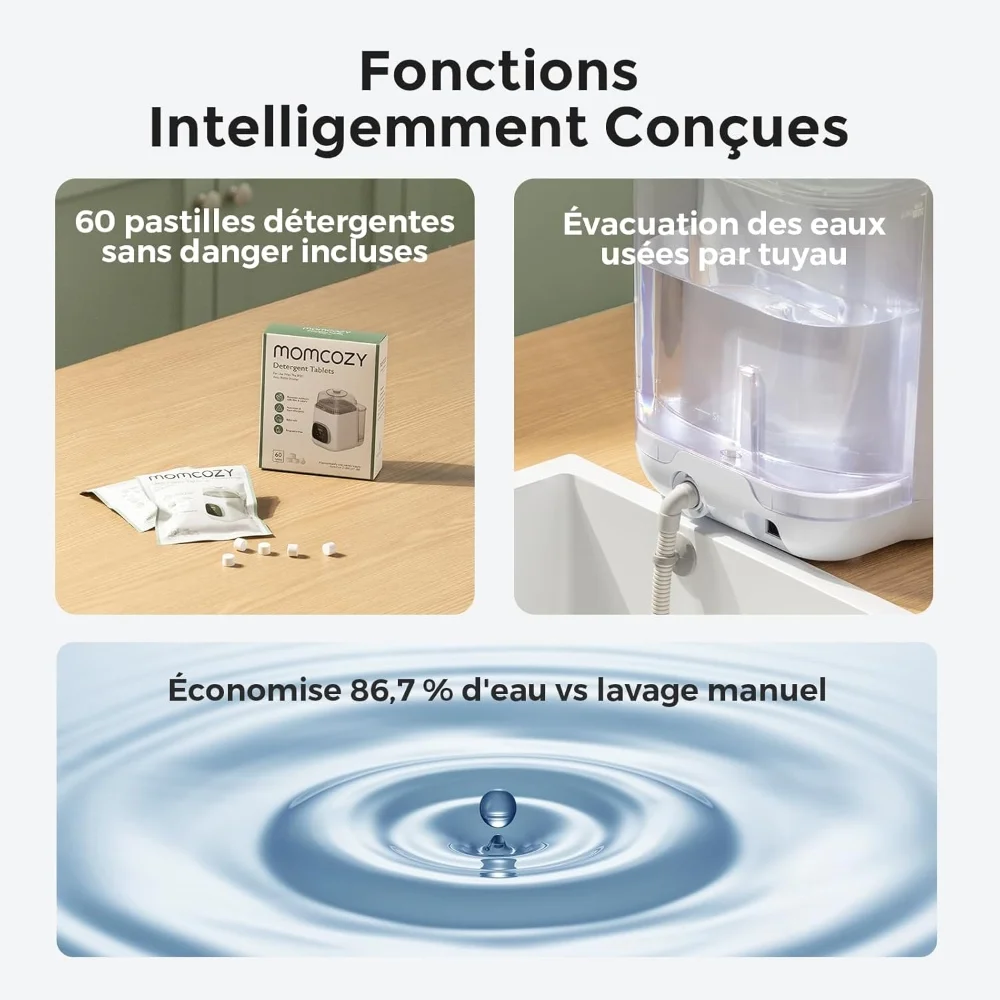 Le lave-biberons fonctionne exclusivement avec les pastilles de détergent Momcozy dédiées, peu moussantes, faciles à rincer et sans danger pour votre bébé. Chaque cycle nécessite une seule tablette pour garantir un nettoyage efficace et sûr. Le réservoir d’eau amovible permet un remplissage unique par cycle et un vidage facile des eaux usées, simplifiant l’entretien de l’appareil.