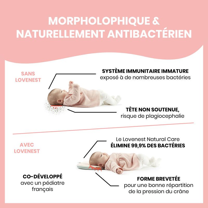 Grâce à la technologie développée par le pédiatre français, le Docteur Maidenberg, le Lovenest+ est le coussin morphologique permettant, aux bébés, de conserver une tête bien ronde. Son inclinaison et sa forme spécifique respectent la forme du crâne du nourrisson tout en garantissant une répartition uniforme de la pression sur le crâne du bébé. Le Lovenest+ offre également un vrai soutien sans empêcher la liberté de mouvement. Avec son tissu Coolmax ® thermorégulant, il s’adapte à la température de bébé pour un confort parfait.
