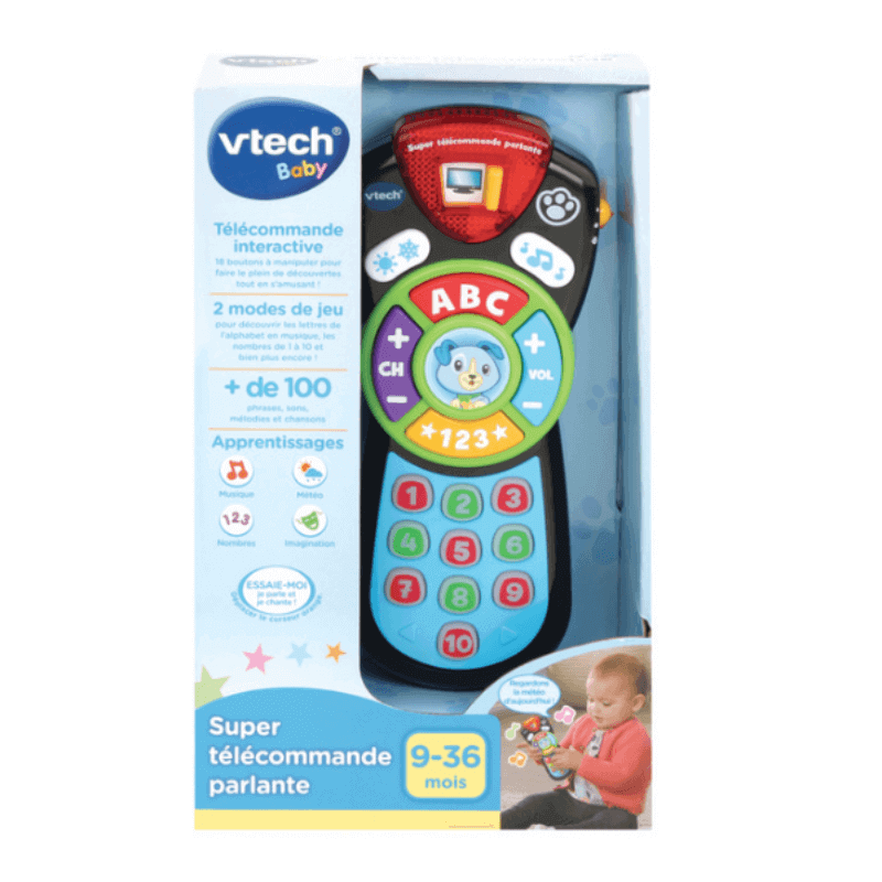 Avec Ma première télécommande parlante de VTech, votre enfant a lui aussi sa propre télécommande pour imiter papa et maman dès son premier âge.Ce jouet éducatif est une télécommande interactive avec 18 boutons à manipuler pour faire le plein de découvertes tout en s’amusant. Elle dispose de 2 modes de jeu pour découvrir les lettres de l’alphabet en musique, les nombres de 1 à 10, des phrases en anglais et bien plus encore.Comme une vraie télécommande, chaque nombre correspond à une chaîne : dessins animés, chaîne de cuisine, de sport… Avec un bouton Musique, ce jouet musical peut déclencher des mélodies entraînantes et Skip informe l’enfant sur la météo du jour grâce au bouton Météo. Ce jeu d’éveil dispose également d’effets lumineux pour attirer l’œil de votre bébé et des sons rigolos.