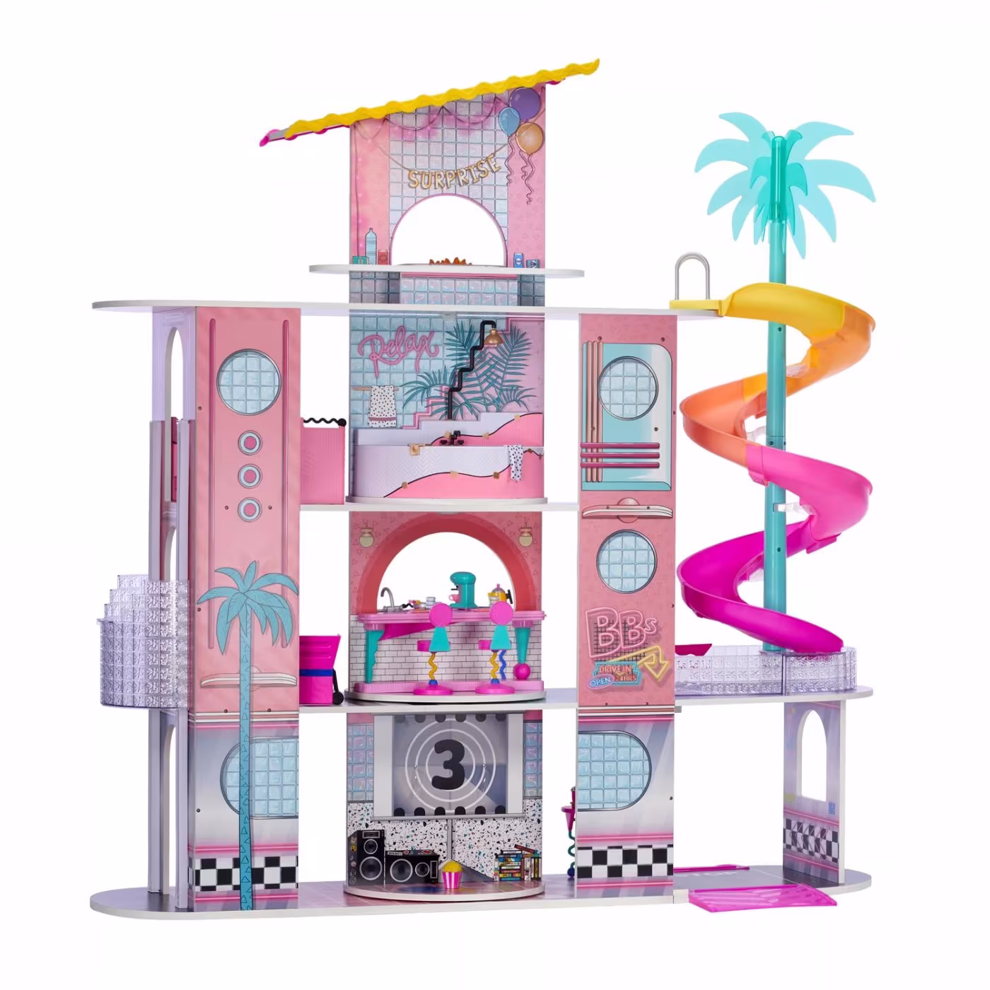 Votre enfant passera des heures à imaginer des histoires grâce aux différents espaces dont dispose la maison de poupée LOL Surprise OMG comme un ascenseur fonctionnel pour 2 à 3 poupées et une piscine avec toboggan spiral. Plusieurs espaces de jeux sont disponibles : piscine, toboggan, rooftop, chambre, salle de bain, cuisine équipée avec lave-vaisselle, …