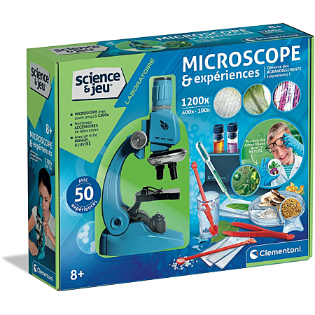 • Un véritable microscope professionnel, simple à utiliser, pour explorer le microcosme et le grossir jusqu’à 1200 fois. • Le coffret propose 50 expériences à réaliser, pour s’amuser avec la science en toute sécurité. • Contient de nombreux instruments pour observer le monde qui nous entoure : lames en plastique, éprouvettes, pipettes, loupe… • Le microscope est doté d’une lumière LED à intensité et inclinaison réglables.