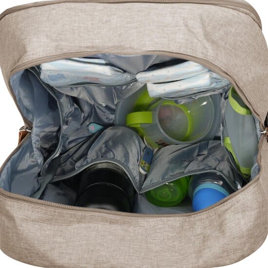 Il dispose d’un matelas à langer de voyage avec une pochette pour couches et lingettes humides, d’un attache-sucette, d’un porte-clés et de 5 poches isothermes.