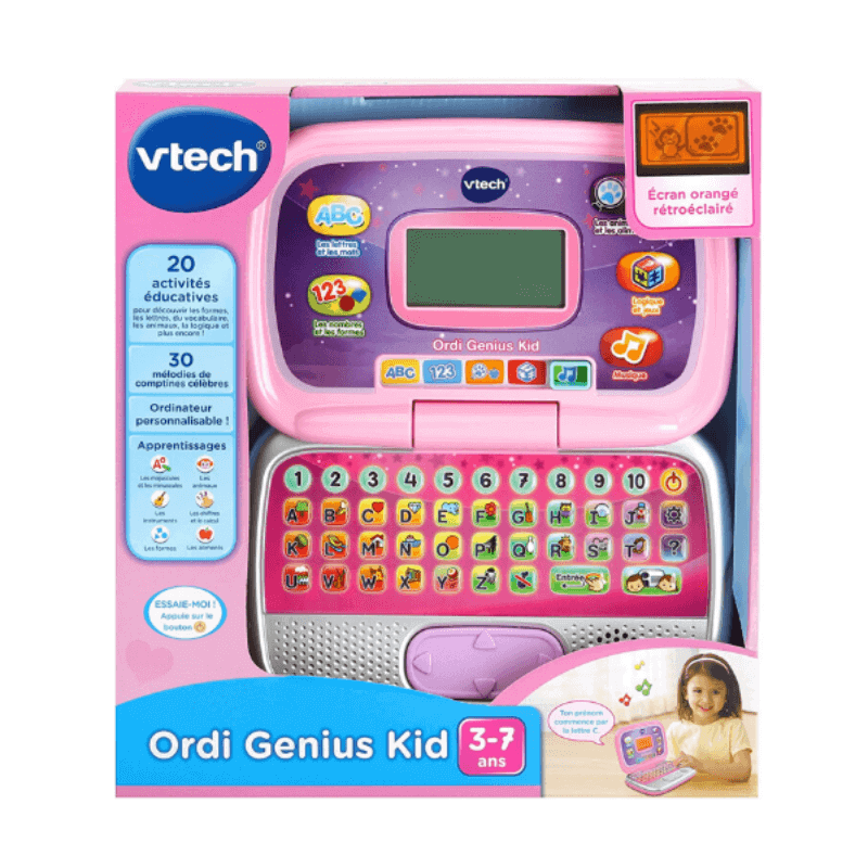 ORDINATEUR GENIUS KID ROSE – VTECH L’Ordinateur Génius Kid rose est le premier ordinateur parlant et musical des petits, votre enfant va pouvoir apprendre en s’amusant et en imitant les grands pendant des heures de jeu.