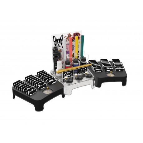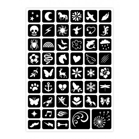 Inclus : 4 feutres de tatouages, 3 encres de tatouages, 4 planches de tatouages temporaires, 2 pots de paillettes, 1 flacon de colle cosmétique, 50 pochoirs autocollants et 1 notice illustrée.