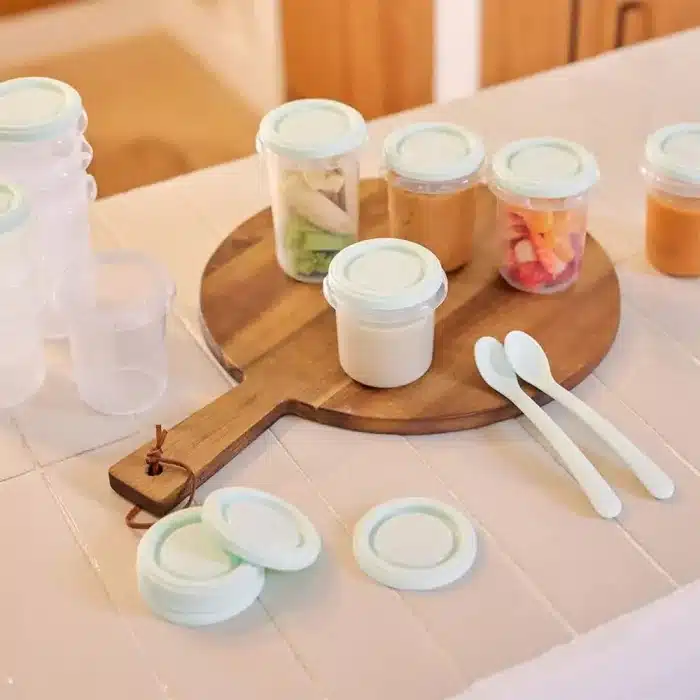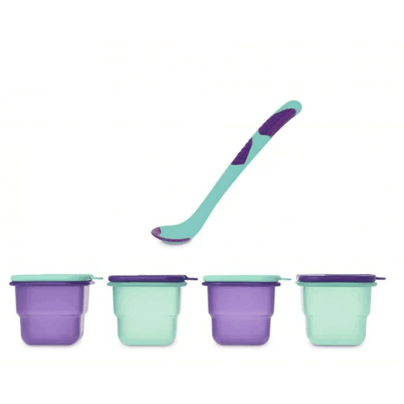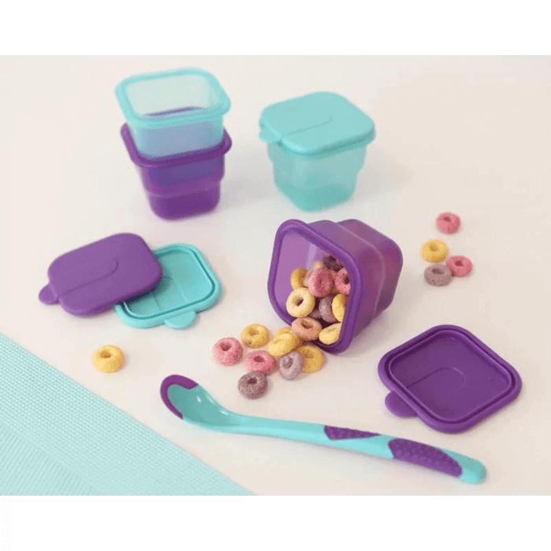 Le set de 12 récipients hermétiques se compose de 4 petits pots de chacune des capacités suivantes : 200ml, 250ml et 330ml. Ce set comprend également deux types de cuillères, une plus douce pour les tout-petits afi n de prendre soin de leurs gencives, et une plus profonde pour les enfants plus âgés.
