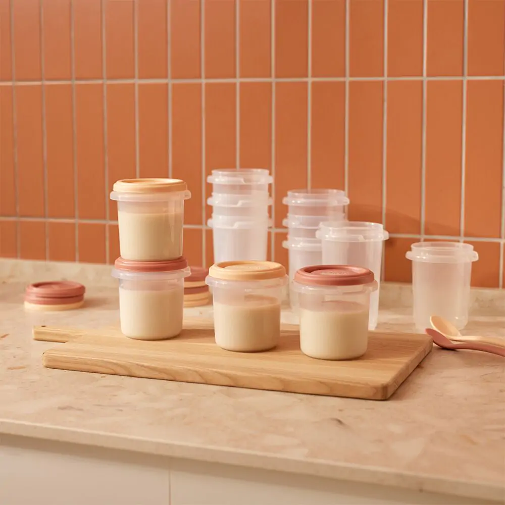 Le set de 12 récipients hermétiques se compose de 4 petits pots de chacune des capacités suivantes : 200ml, 250ml et 330ml. Ce set comprend également deux types de cuillères, une plus douce pour les tout-petits afi n de prendre soin de leurs gencives, et une plus profonde pour les enfants plus âgés.