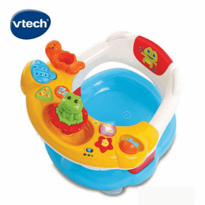 Acheter maintenantCe super siège de bain interactif 2 en 1, accompagne votre bébé dans son éveil à l’intérieur du bain grâce au siège et à l’extérieur avec le tableau d’activités interactif détachable.Le siège de bain VTech dispose de 4 ventouses pour fixer le siège dans la baignoire et permet des jeux d’eau amusants en toute sécurité. Le tableau d’activités contient une grenouille qui éclabousse lorsque l’on appuie sur sa tête, l’otarie qui est un jouet de bain détachable qui lui permet de verser de l’eau et un moulin à eau à manipuler.Le tableau d’activité est musical, il permet à votre bébé d’écouter plus de 70 chansons, mélodies, sons et phrase amusantes. Il est aussi éducatif car votre bébé peut manipuler les 4 boutons lumineux pour faire le plein de découvertes : couleurs, formes, chiffres, animaux.Avec le super siège de bain interactif 2 en 1, votre bébé développe aussi sa motricité en manipulant les différents éléments, ses capacités visuelles grâce aux couleurs, lumières et jets d’eau.Réglage du volume sonore. Complètement étanche. Supporte 13 kg maximum.