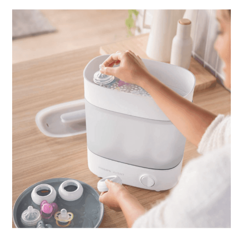 Ayez l’esprit tranquille en sachant que les biberons, les suces et les autres articles de votre bébé sont exempts de germes avec le stérilisateur électrique à vapeur Avent Advanced de Philips.
