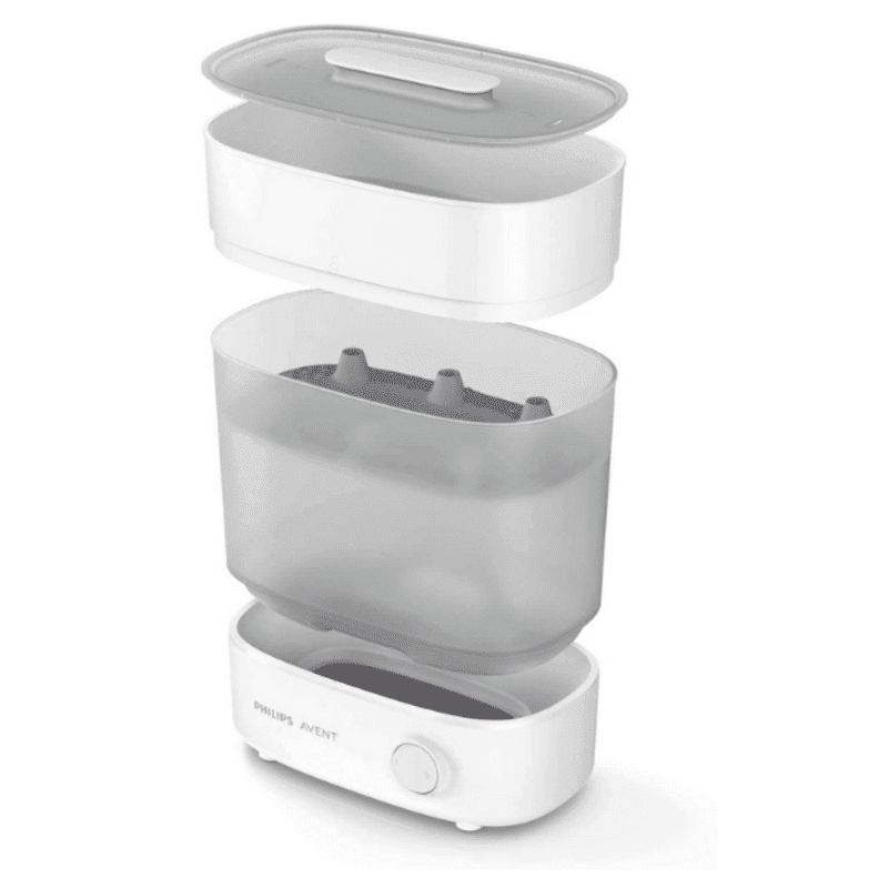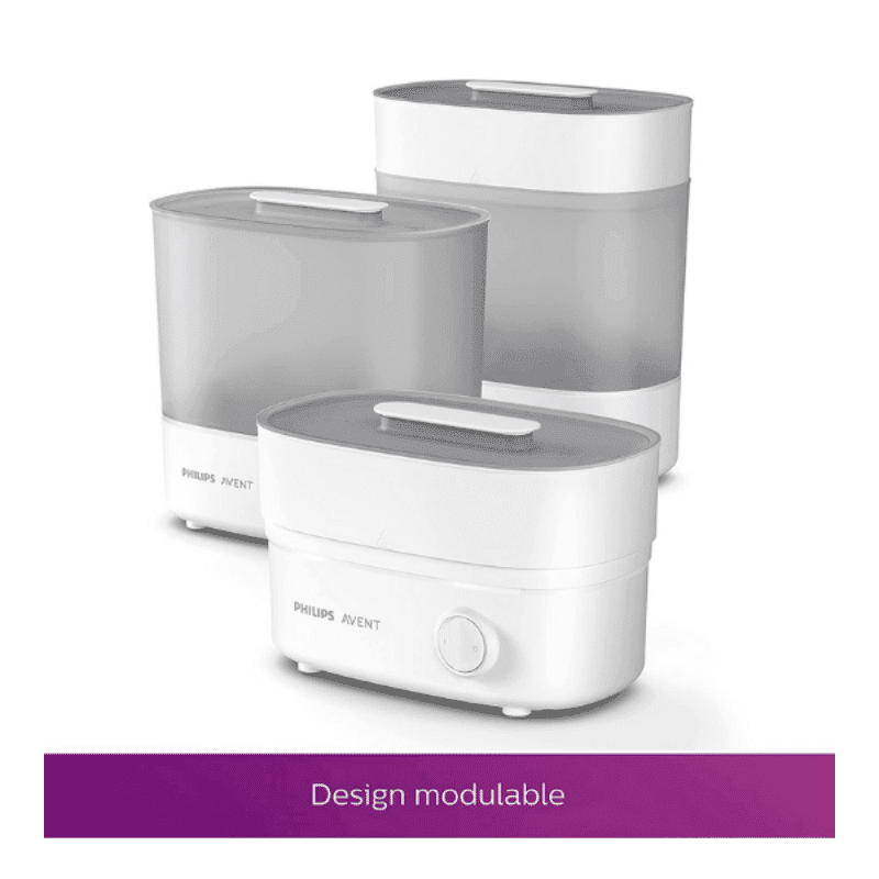 La conception modulaire unique du stérilisateur est facilement ajustable à vos différents biberons et accessoires et permet un positionnement simplifié. Le chargement et le déchargement sont ainsi rendus pratiques et l’espace occupé dans votre cuisine est réduit.