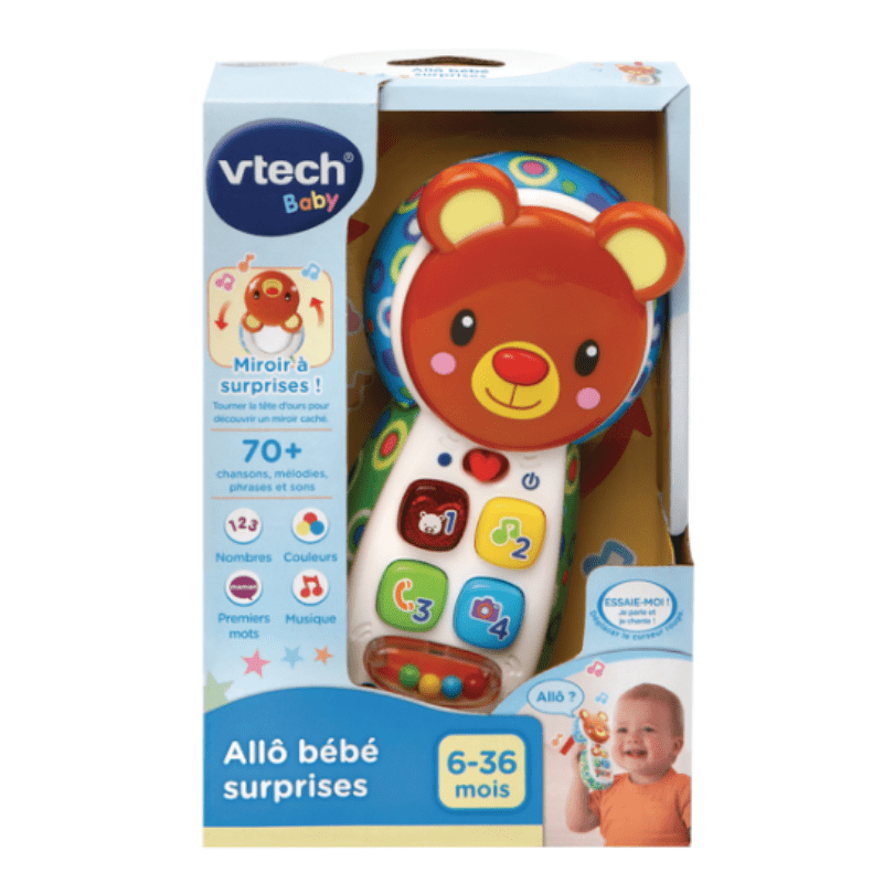Allô bébé surprises brun est le premier portable interactif de votre bébé pour imiter les grands pendant des heures de jeu.