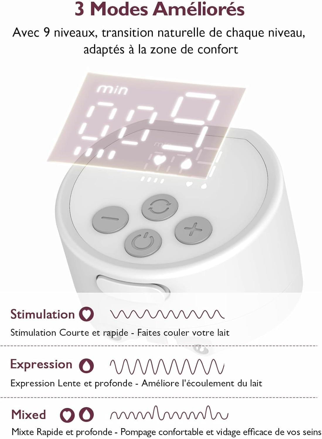 - Pompage sans effort – 3 modes améliorés (stimulation+expression+mixte) qui imitent naturellement l’alimentation de votre enfant, et 9 niveaux conçus pour offrir plus de flexibilité. Personnalisez votre pompe afin qu’elle démarre toujours avec vos réglages préférés pour une séance de pompage efficace.