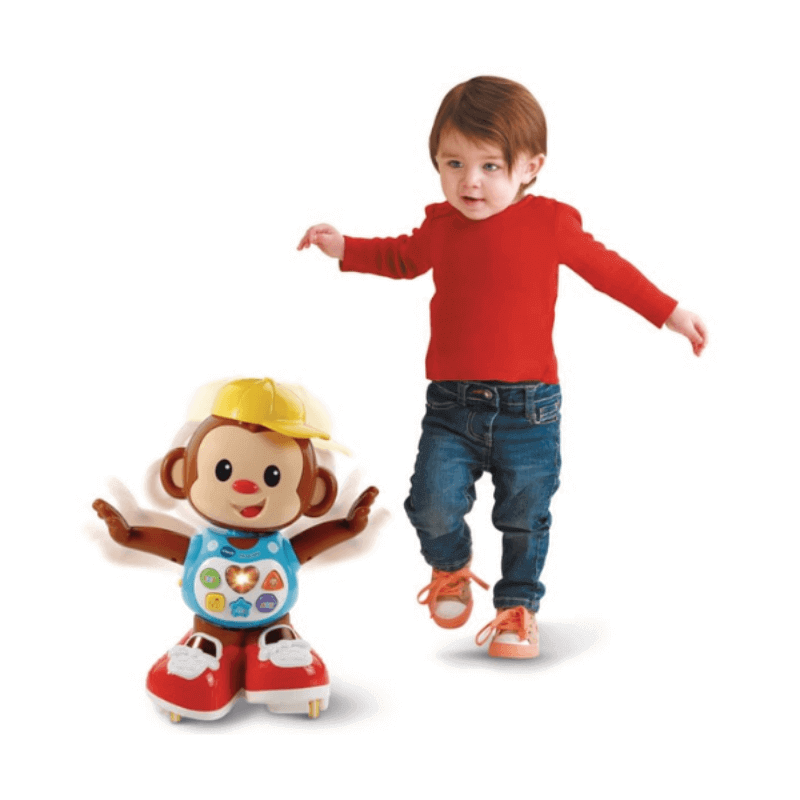 Le petit singe se déplace, tourne sur lui-même et incite votre bébé à le suivre (deux détecteurs de mouvements à l’avant et à l’arrière) et permettra à votre enfant de développer sa motricité. Les capteurs avant/arrière permettent au petit singe de détecter les obstacles et de les contourner. Votre enfant va pouvoir imaginer des histoires amusantes avec ce petit ouistiti.