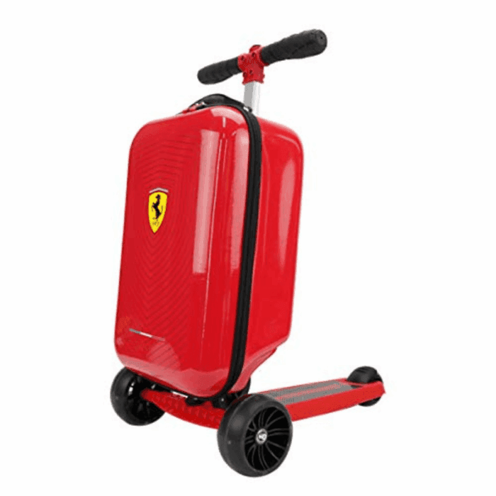 Trottinette Ferrari pour enfants : la trottinette à 3 roues se plie en un bagage à roulettes à deux roues.
