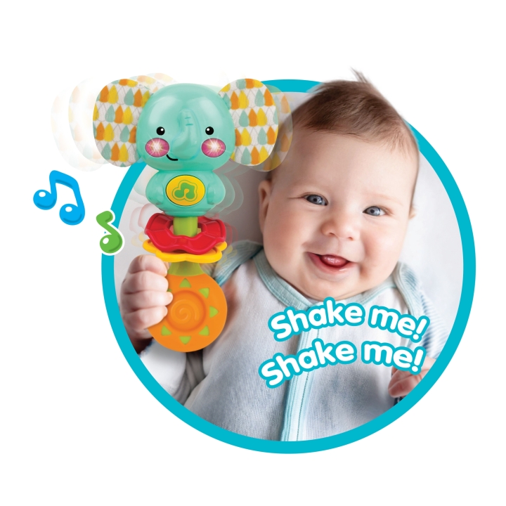 En appuyant sur le bouton mélodie, les joues lumineuses de l’éléphant s’illuminent tandis que résonnent chansons, sons amusants et phrases joyeuses. Les anneaux à secouer produisent un doux bruit de hochet qui stimule l’ouïe et la coordination main-œil.